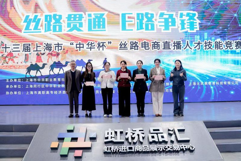 20251129日,第十三届中华杯丝路电商直播人才技能竞赛在虹桥品汇直播基地成功举办。本届比赛由上海中华职业教育社、上海市人力资源和社会保障局、上海市教育委员会共同主办。本场竞赛由闵行中华职业教育社、上海闵行职业技术学院、上海虹桥国际进口商品展销有限公司、上海火凤鼎教育科技有限公司共同承办,上海市高职高专经济类专业教学指导委员会、上海投创网络科技有限公司协办。我校经济管理学院教师陈洁、张培培凭借扎实的专业素养与出色的现场发挥,在激烈角逐中脱颖而出,荣获上海市三等奖。